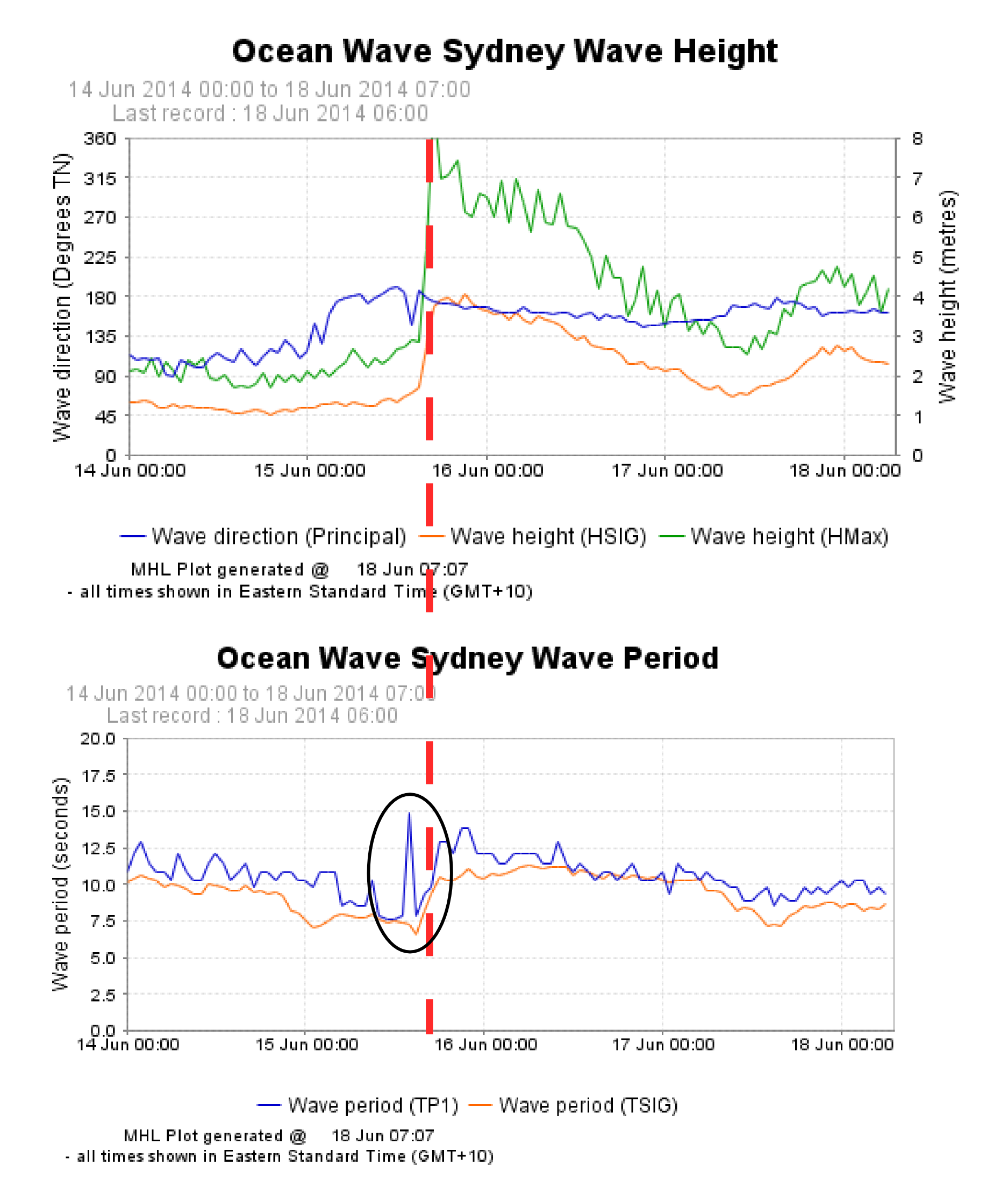 Take a look at the recorded offshore wave data provided by Manly Hydraulics lab for Sydney which clearly shows the rapid onset of 4 m plus significant wave heights with a maximum wave height off the scale, greater than 8 m. This is a large swell event for this region but also relatively short lived, lasting only a day or two. The swell also shifted to being almost directly from the south with south facing beaches significantly impacted. What is interesting about this swell event is the peak in wave period of 15 seconds (black circle) which precedes the main component of the swell of about 12-13 seconds and Hs of 4 m which (defined by the dotted line).