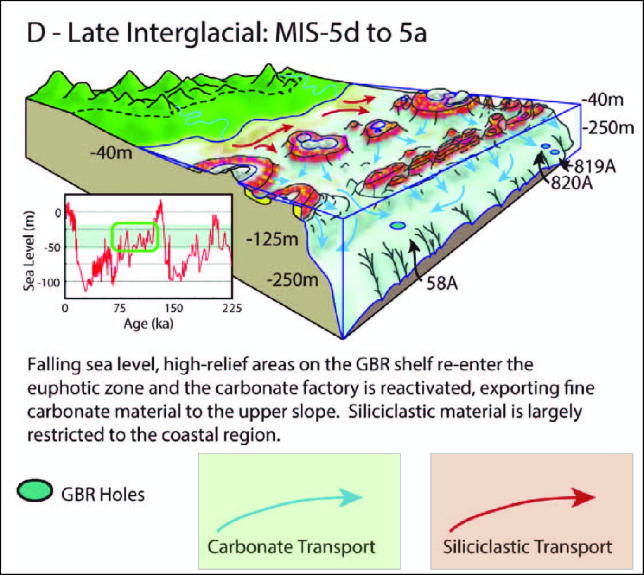 Surprisingly we find that the peak of maximum neritic aragonite (i.e. shallow water carbonate) export to the upper slope occurred not during peak MIS-5e highstand (~125 ka) when sea level was a few meters above modern position, but during a time (~115- 80 ka) when lowered sea level fluctuated between 30 and 50 m below present sea level. Check it out!