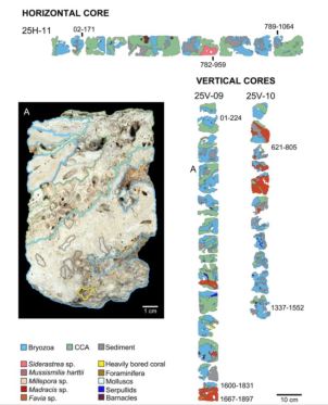 Rather than a typical coralgal reef, our results show a complex framework building system dominated by bryozoans. Bryozoans were major components in all cores and age intervals (2,000 yrs BP), accounting for up to 44% of the reef framework, while crustose coralline algae and coral accounted for less than 28 and 23%, respectively.
