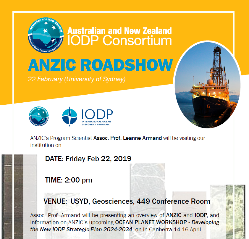 Assoc. Prof. Armand will be presenting an overview of ANZIC and IODP, and information on ANZIC’s upcoming OCEAN PLANET WORKSHOP – Developing the New IODP Strategic Plan 2024-2034, on in Canberra 14-16 April. This is a unique opportunity to become aware of ANZIC – IODP and the current and future opportunities available to the Geoscience, Biogeo and Microbial communities.