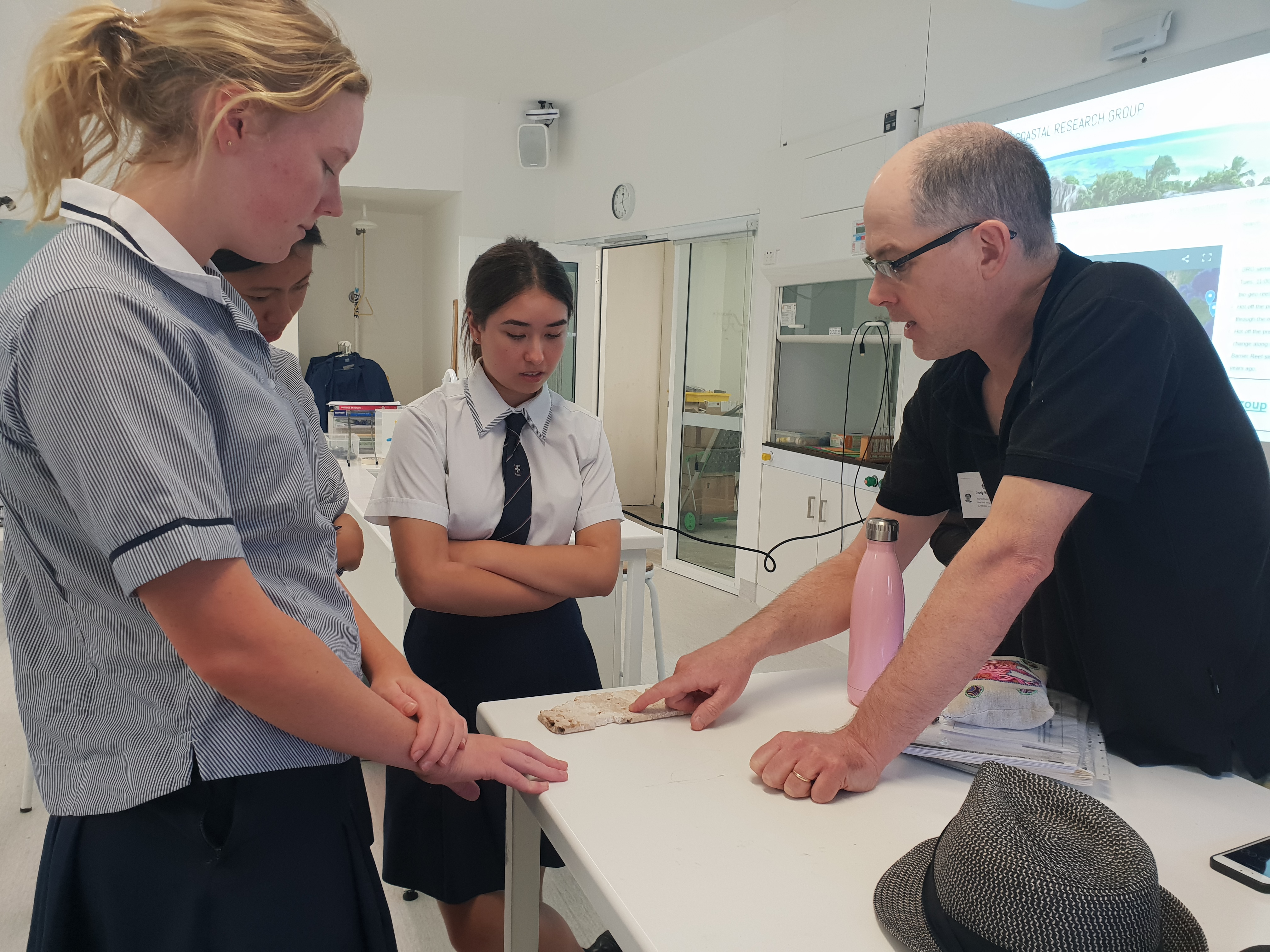 Hi All, a couple of weeks ago I was fortunate enough to be invited to give a seminar out at Wenona – a fantastic private girls over in North Sydney. My audience was a small but very enthusiastic year 12 Earth Science class who are currently studying a special Elective on geologic records of climate change. We did some show and tell of some interesting fossil reef cores.