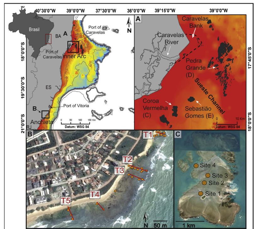 For the first time, this work investigates Holocene reefs flat evolution, sea level and climate variability along the eastern margin of Brazil. The paper’s specific objectives were to 1) undertake a detailed chronological analysis of closely spaced ages across these reefs to establish the timing of when they first approached sea level and 2) identify and constrain any observed relative sea level oscillations and/or reef flat hiatuses and attribute any potential response to global climatic or regional environmental changes.