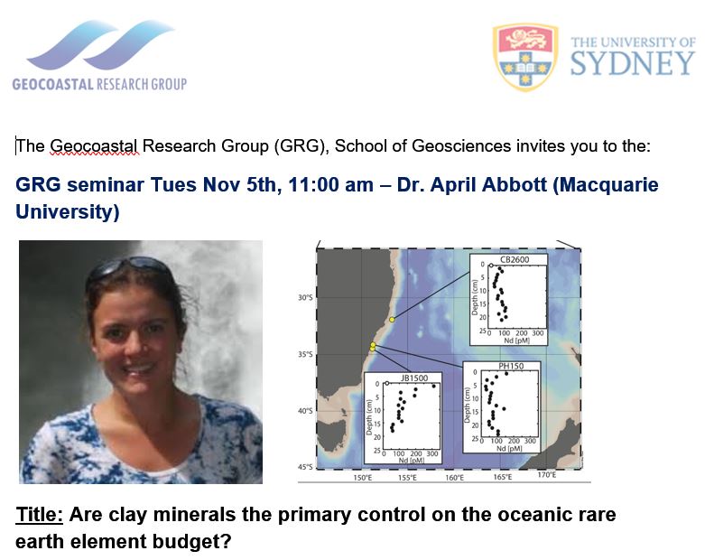 Bio: Dr April Abbott is a geochemical oceanographer and pore water geochemist with over 250 days at sea. She has been a lecturer in the Department of Earth & Planetary Sciences (now Department of Earth and Environmental Sciences) at Macquarie University since 2016. Her research focuses on the intersection of our understanding of modern biogeochemical cycles with the application of geochemical proxies to paleoclimate reconstructions. She received her PhD in Ocean, Earth and Atmospheric Sciences from Oregon State University in 2016, her masters of science from University of Minnesota Duluth in 2011, and her bachelor of science from William Smith College in 2009. She is currently director of Australia’s only at sea marine science training program, the Collaborative Australian Postgraduate Sea Training Alliance Network (CAPSTAN).