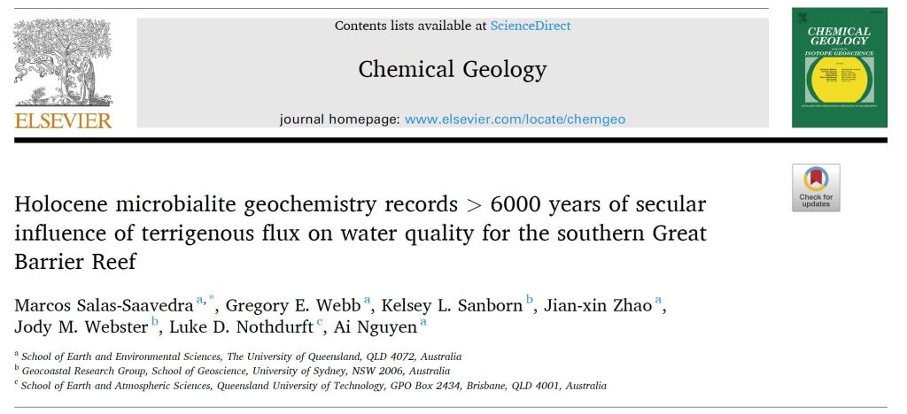 Salas-Saavedra, M., Webb, G.E., Sanborn, K.L., Zhao, J.-x., Webster, J.M., Nothdurft, L.D. and Nguyen, A., 2022. Holocene microbialite geochemistry records > 6000 years of secularinfluence of terrigenous flux on water quality for the southern Great Barrier Reef. Chemical Geology, 604. https://doi.org/10.1016/j.chemgeo.2022.120871