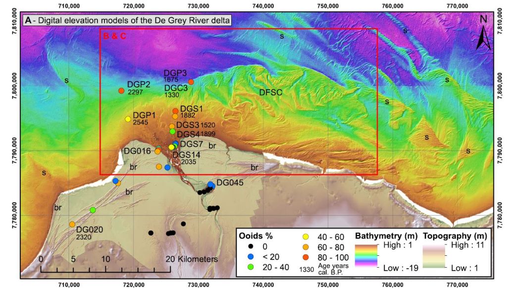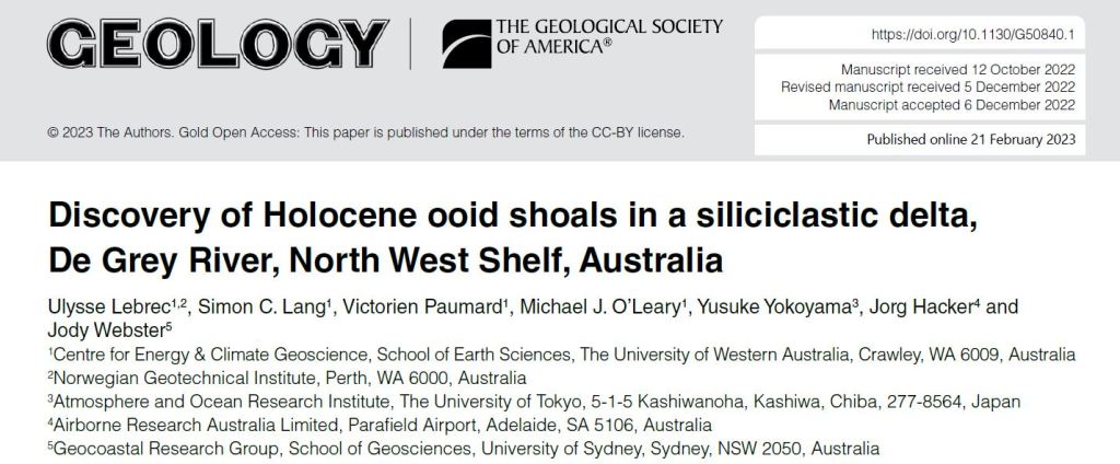 Lebrec, U., Lang, S.C., Paumard, V., O’Leary, M., Yokoyama, Y., Hacker, J. and Webster, J. M., 2023. Discovery of Holocene ooid shoals in a siliciclastic delta, De Grey River, North West Shelf, Australia. Geology. https://doi.org/10.1130/G50840.1