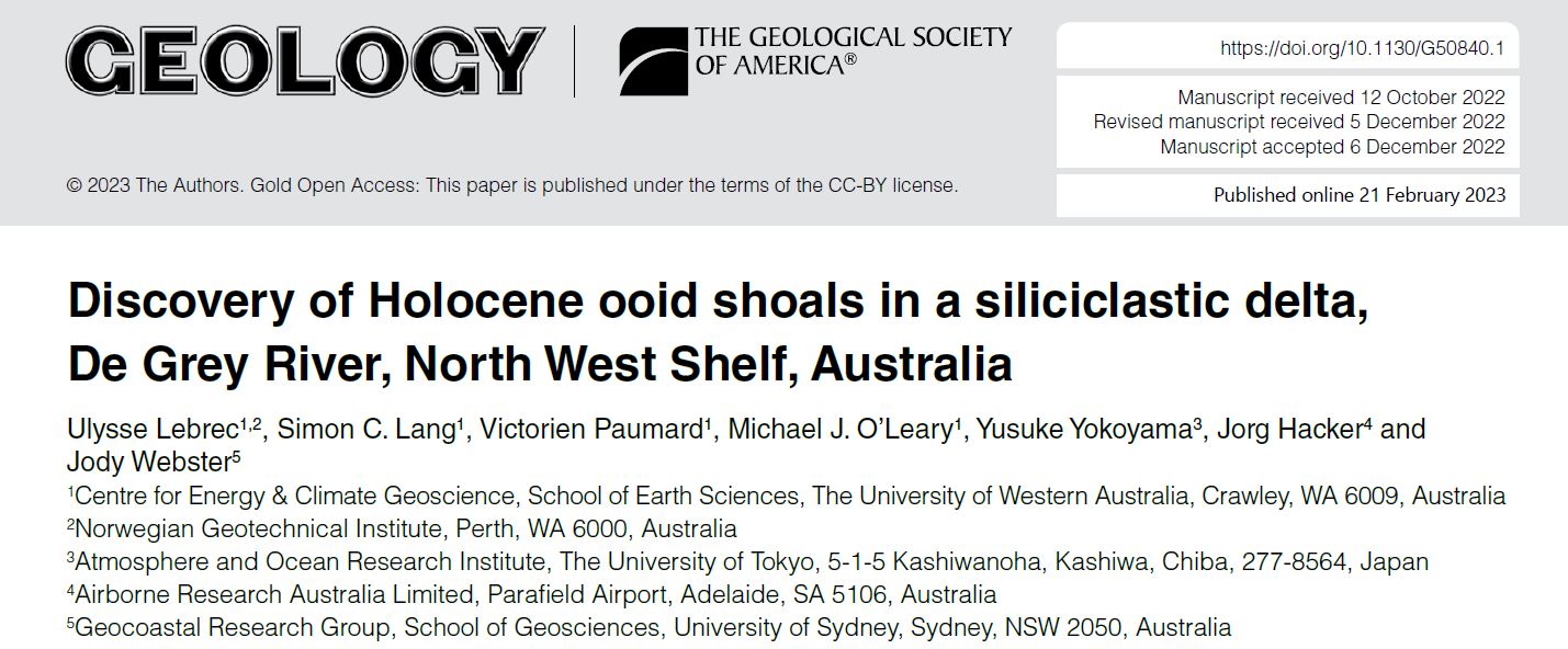 Lebrec, U., Lang, S.C., Paumard, V., O’Leary, M., Yokoyama, Y., Hacker, J. and Webster, J. M., 2023. Discovery of Holocene ooid shoals in a siliciclastic delta, De Grey River, North West Shelf, Australia. Geology. https://doi.org/10.1130/G50840.1