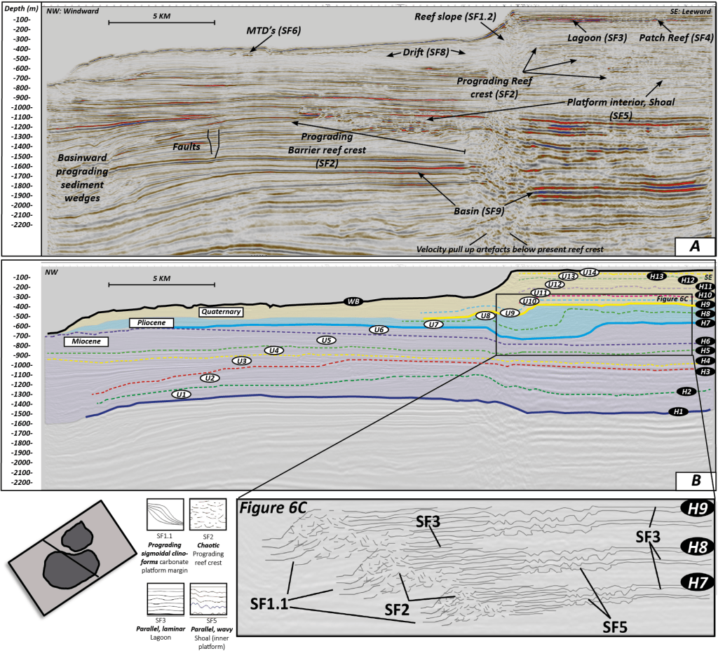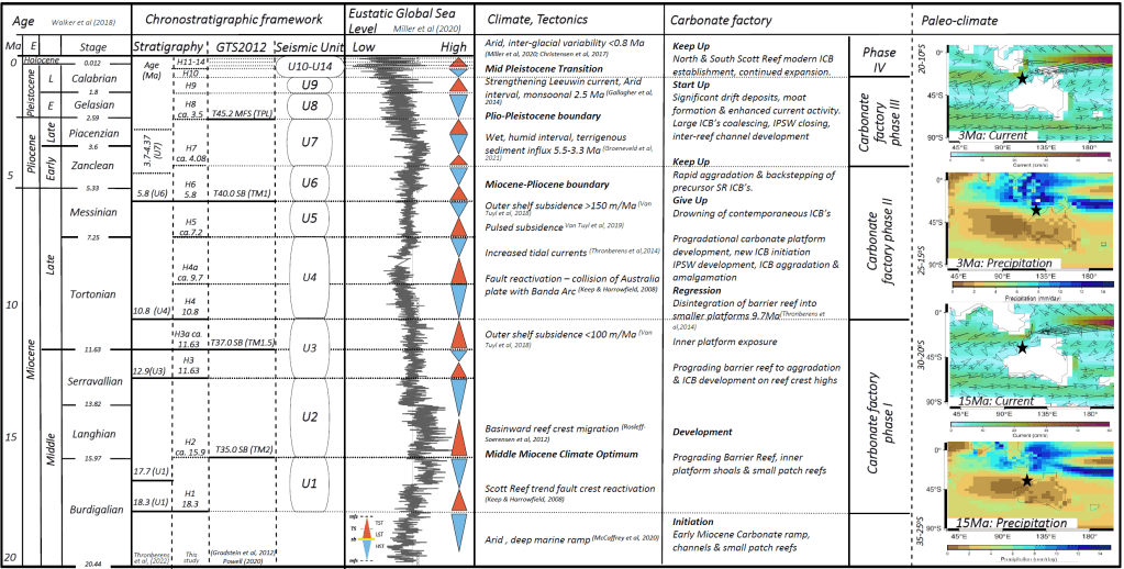 The paper presents a detailed seismic stratigraphic interpretation of newly reprocessed 3D seismic data, combined with well log data and preliminary core dating that reveals the tectonostratigraphic histories and evolution of North and South Scott Reefs since the Miocene. For the first time, it was possible to reconstruct a chrono-stratigraphic framework, detailing relative sea-level (RSL) changes and the impact of global (e.g., climate, eustasy) and regional (e.g., tectonics) forcing parameters on their development.