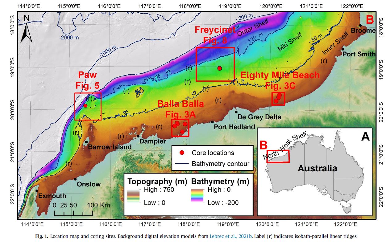 Lebrec, U., Riera, R., O’Leary, M., Webster, J.M., Yokoyama, Y., Gliganic, L.A., Lang, S.C. and Paumard, V., 2023. Drilling 1100-km-long seafloor ridges reveals how palaeoshorelines control carbonate shelf morphologies (North West Shelf, Australia). Quaternary Science Reviews, 312. https://doi.org/10.1016/j.quascirev.2023.108164