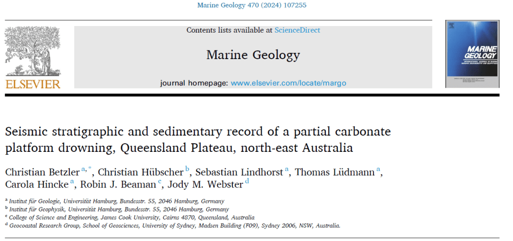 Betzler, C., Hübscher, C., Lindhorst, S., Lüdmann, T., Hincke, C., Beaman, R. J., and Webster, J. M., 2024, Seismic stratigraphic and sedimentary record of a partial carbonate platform drowning, Queensland Plateau, north-east Australia: Marine Geology 470. https://doi.org/10.1016/j.margeo.2024.107255. This paper is Open Access so feel free to download it directly here.