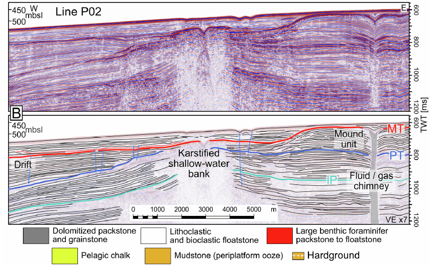 Platform Top horizon; red line: Mound Top horizon; Cyan line: Intra Platform horizon (Betzler et al., 2024 – Marine Geology).