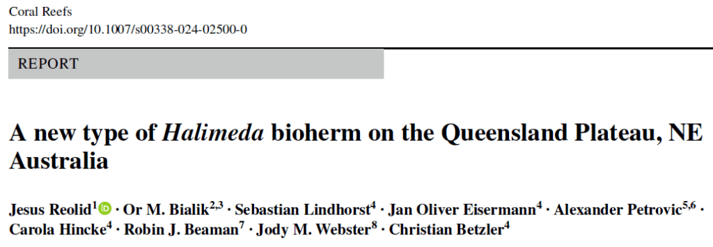 Reolid, J., Bialik, O. M., Lindhorst, S., Eisermann, J. O., Petrovic, A., Hincke, C., Beaman, R. J., Webster, J. M.,and Betzler, C., 2024, A new type of Halimeda bioherm on the Queensland Plateau, NE Australia: Coral Reefs. This paper is Open Access so feel free to download it directly here.