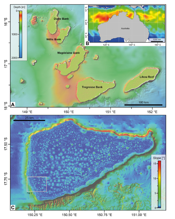 The paper presents a comprehensive analysis of newly collected high-resolution marine geophysical data (multbeam bathymetry, sub-bottom profiles, high-resolution sea floor imagery, and discrete sediment samples) collected during the RV Sonne Cruise (SO292) in 2022 to investigate the evolution and partial drowning of the Queensland Plateau, off the North Eastern Australian margin, as well as the modern deep water habitats and benthic communities.
