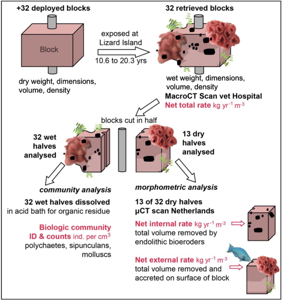 This landmark study presents the longest-running coral bioerosion experiment ever conducted on the Great Barrier Reef, using Porites skeleton blocks deployed for 10–20 years across six reef zones around Lizard Island. By combining micro-CT imaging with detailed biological analyses, the study provides unparalleled insight into how coral skeletons are broken down—or occasionally rebuilt—over decadal timescales.