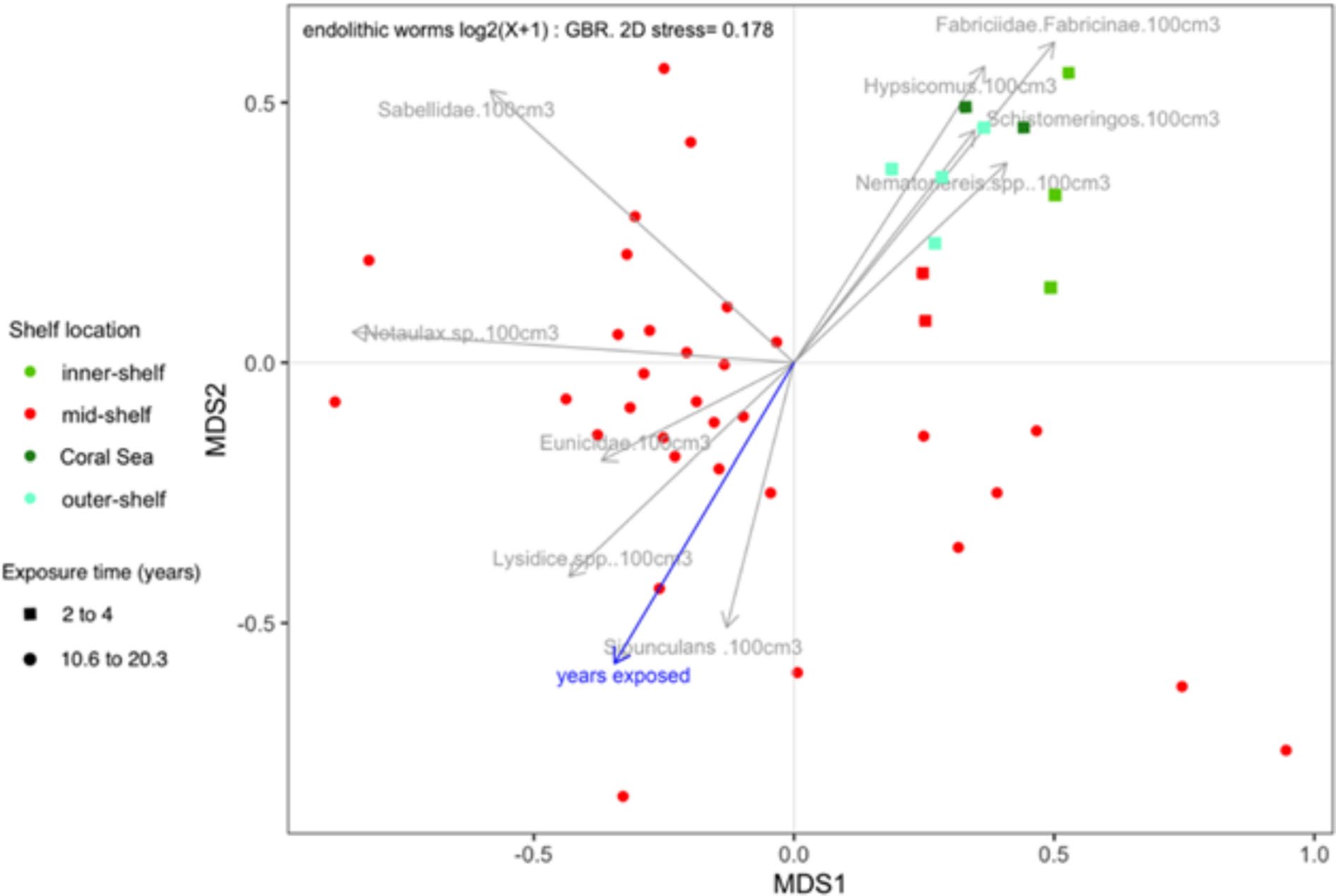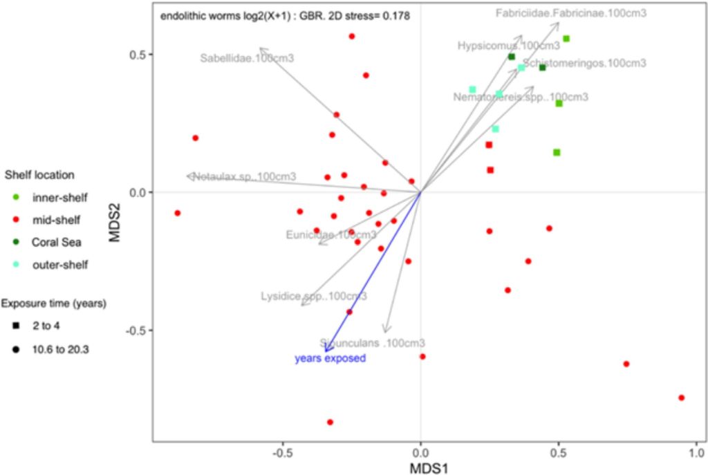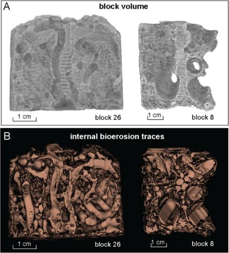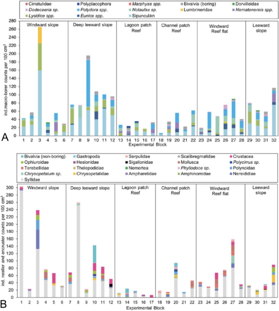 • Rich and variable endolithic communities: Worms—especially sipunculans and polychaetes—dominated internal borings, with abundances varying strongly by depth and zone.