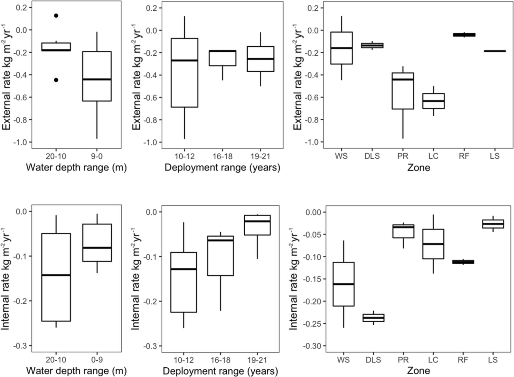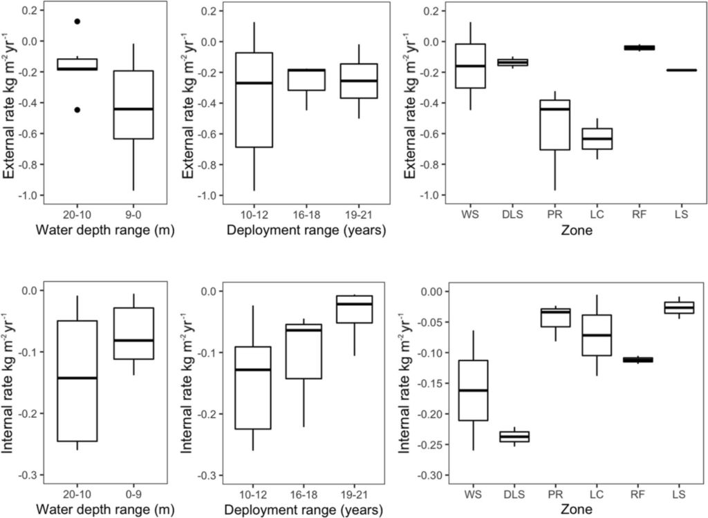 • Balance of internal vs. external processes: External erosion (mainly grazing and physical abrasion) generally exceeded internal boring, except on the Windward flat and Deep leeward slope where both processes were nearly equivalent.