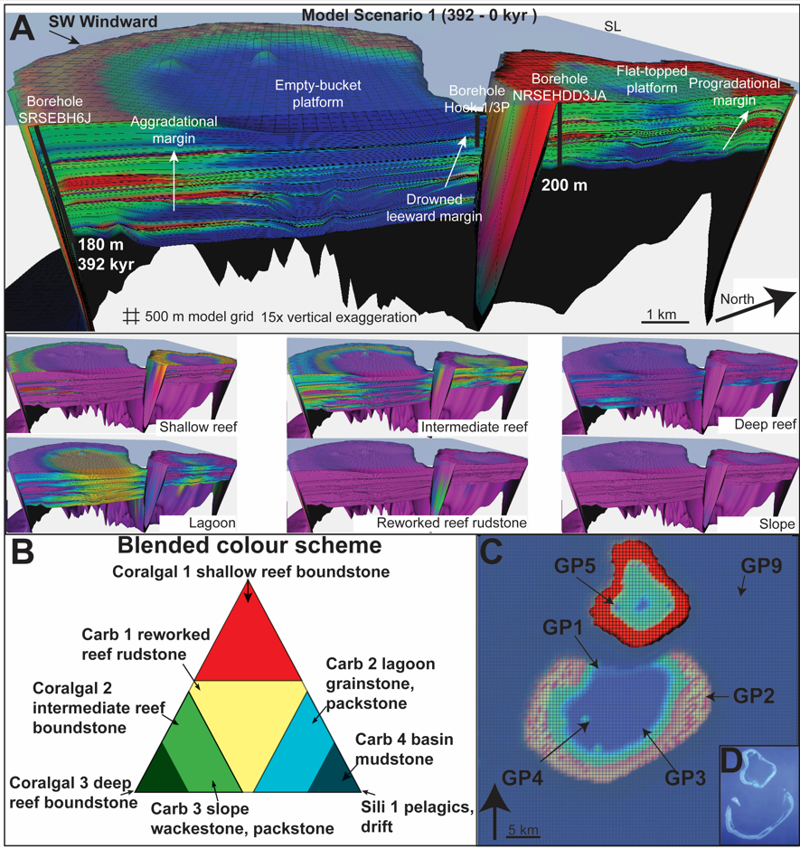 Modelling approach: Three-dimensional carbonate Geologic Process Modelling (GPM) in Petrel, calibrated using a base-case model (392 ka to present) and extended to 1.2 Ma through sensitivity testing.