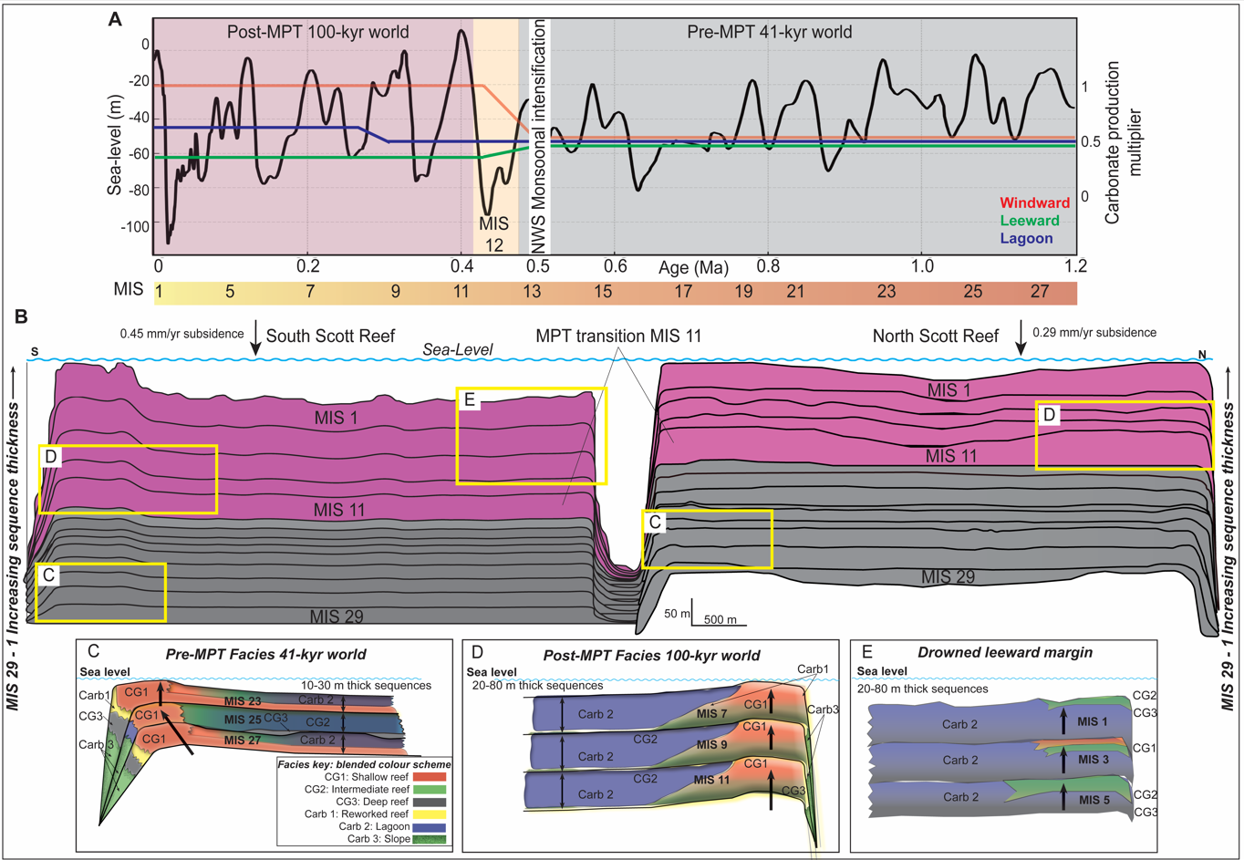 Conceptual sketch of the MPT model (1.2 Ma to present) simulated sequence stratigraphy of North and South Scott Reef, showing the transition from 41 kyr, pre-MPT keep-up reef sequences (10–30 m thick, progradational, shallow reef–dominated margins) (panel C), to 100 kyr post-MPT catch-up sequences (20–50 m thick, aggradational, deeper reef dominated) (panel D). The prolonged MIS 11 highstand is a major step in producing the “empty bucket” morphology and leeward margin drowning of the South Reef that is postulated to have functioned in relation to increased amplitude and reduced periodicity of sea-level cycles and increased monsoonal intensification during interglacials. The model illustrates one possible iteration of the transition from a 41 kyr cycle with 60m amplitude from 1.2 – 0.7 Ma (MIS 29-17), to a longer 100 kyr cycle with 120m amplitude, which becomes more pronounced after the MPT. This is primarily a result of increasing subsidence through time, which is contrary to the forcing of eustacy alone. Panels A-D show detailed facies responses to the sea-level oscillations of the pre-MPT and post-MPT world, respectively. Panel E illustrates the give-up reef on the drowned leeward margin of South Scott Reef post-MPT due to decreased carbonate production and increased water depth.