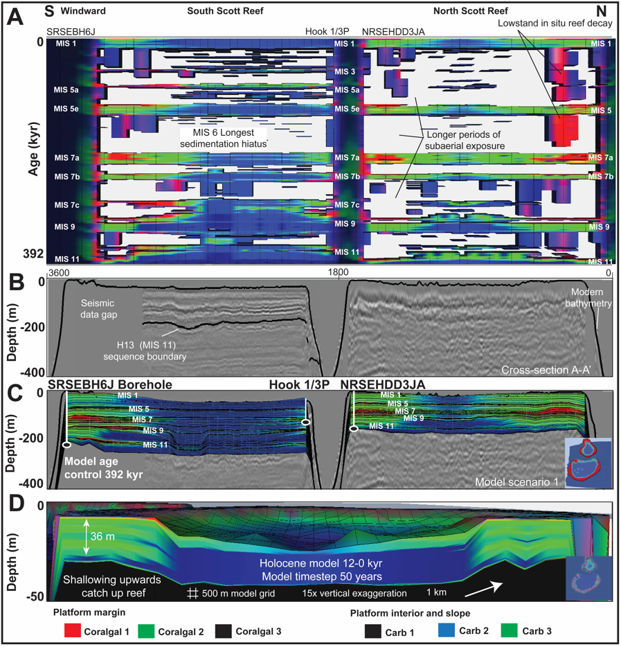 Scope: Quantitative reconstruction of the Quaternary evolution of the North and South Scott Reef carbonate platforms using data-calibrated forward stratigraphic modelling (FSM), spanning ~1.2 Ma to present.